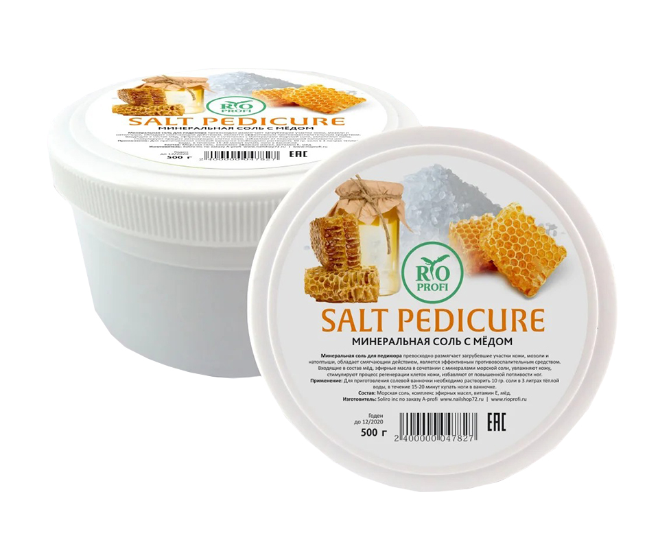 Минеральная соль для педикюра превосходно размягчает загрубевшие участки кожи, мозоли и натоптыши, обладает смягчающим действием, является эффективным противовоспалительным средством. Входящие в состав: мёд, эфирные масла в сочетании с минералами морской соли увлажняют кожу, стимулируют процесс регенерации клеток кожи, избавляют от повышенной потливости ног.