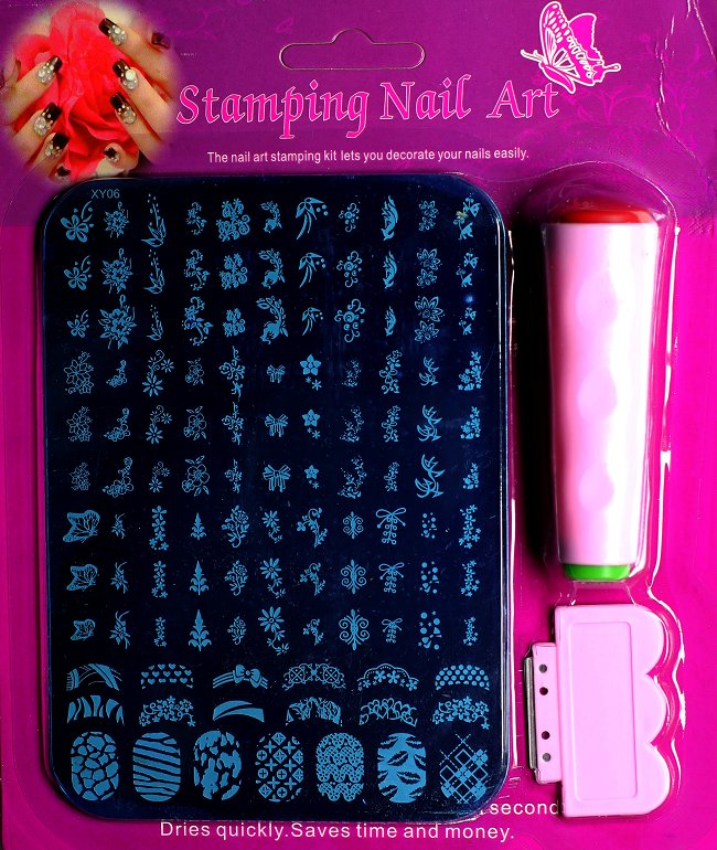 Набор для стемпинга состоит из двухстороннего штампа, скребка(скрапера), большой пластины с рисунками. С помощью двухстороннего штампа легко нанести как мелкий, так и крупный рисунок. Пластины с дополнительными рисунками можно приобрести на сайте отдельно
